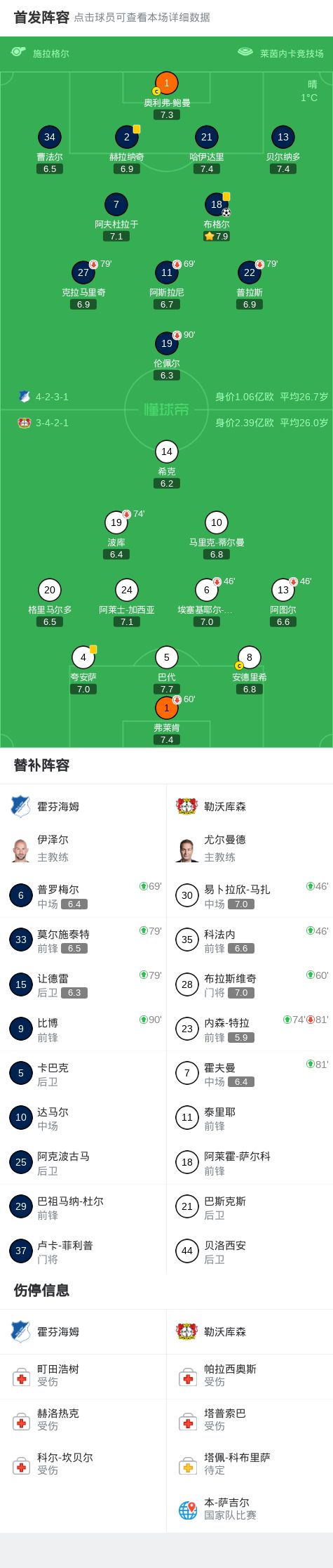 第9分钟,布格尔任意球直接破门,霍芬海姆1-0勒沃库森